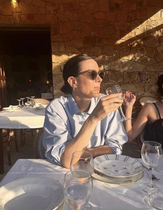 这张我太爱了,简单基础的蓝色衬衫,有了墨镜和耳饰的加持,在阳光下的照耀下,太时髦啦,直接可以当画报的程度。