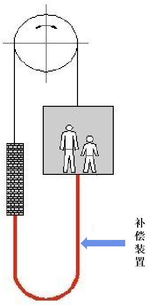 补偿装置用来平衡由于电梯提升高度过高,曳引钢丝绳过长造成运行过程中钢丝绳重量单侧偏重现象的部件,常见的类型有补偿链、补偿缆和补偿绳。