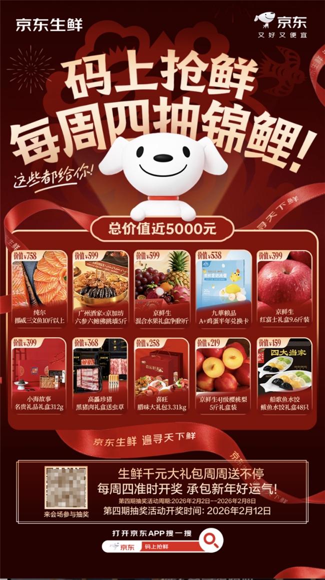 整个年货节期间,“码上抢鲜”千元年货大礼包抽奖活动持续开展,消费者购买指定年货礼盒后,扫描礼盒腰封二维码或搜索“码上抢鲜”即可参与报名,每周抽取一位“年货锦鲤”。目前,第四期抽奖已火热开启,奖品包含10斤以上纯尔挪威三文鱼、5斤广州酒家x京加坊六参六鲍佛跳墙、9斤京鲜生混合水果礼盒等,总价值近5000元,最终结果将于2月12日公布,邀消费者一起“接好运”、添年味。