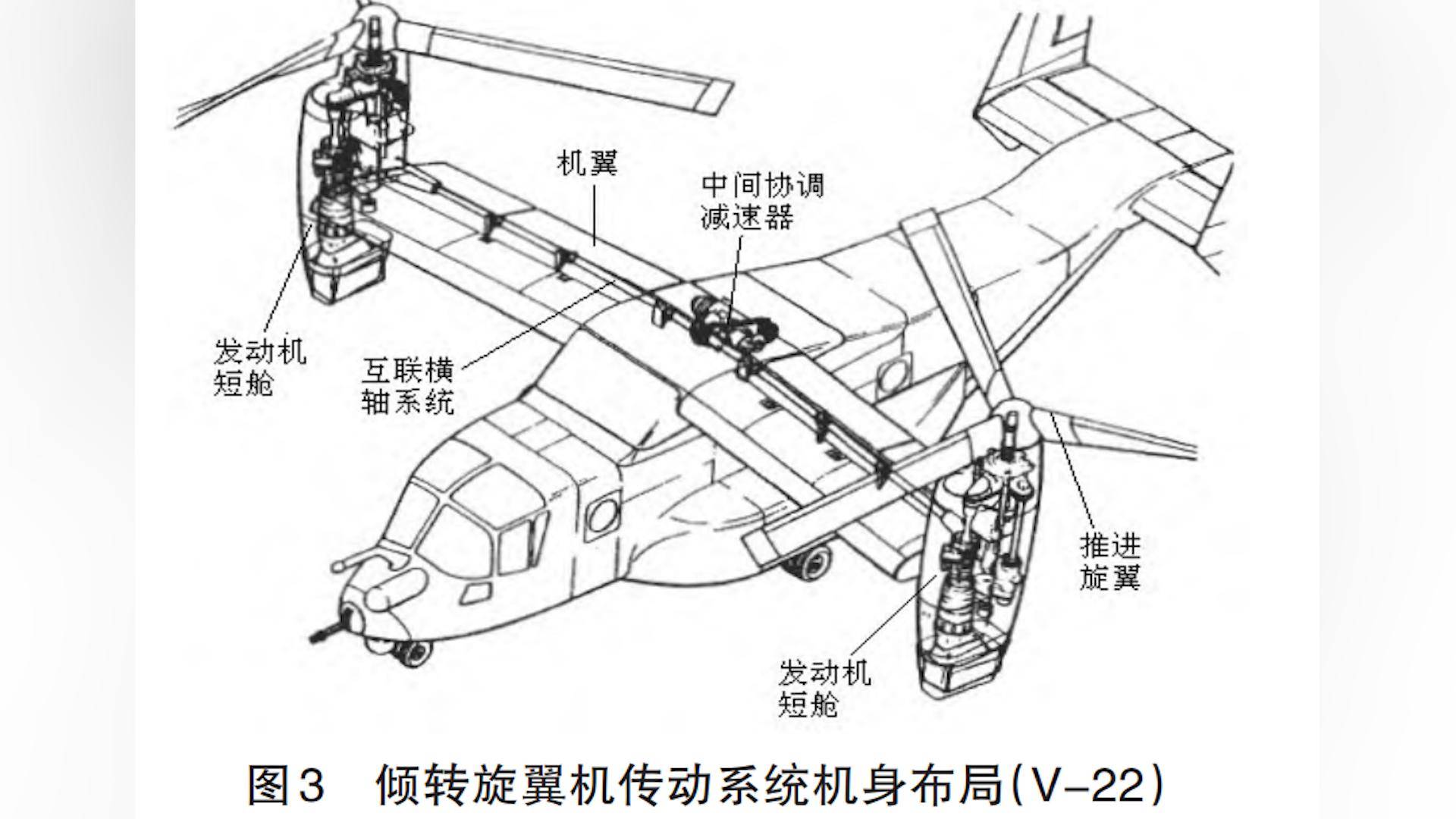倾转旋翼机的研发为何如此困难?其根本原因在于其复杂的传动系统构型。相比于常规直升机,倾转旋翼机的传动系统要复杂得多。直升机的传动系统通常由主减速器、中间减速器、尾减速器、动力传动轴和尾传动轴五大部件组成,通过这些部件将发动机的动力传递到主旋翼、尾桨及其他附件上。而倾转旋翼机的传动系统则完全不同,采用了横列式双旋翼结构,包含了左右减速器、互联传动轴及中间减速器,这使得传动系统变得更加复杂。除了要承受复杂的载荷外,传动系统还需要实现旋翼的倾转和发动机功率的互联传递。