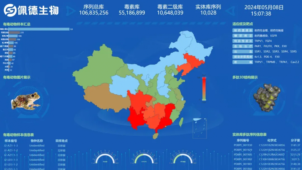 有毒动物(如蟾蜍、胡蜂、蜈蚣、蝎子、水蛭、毒蛇等)历经上亿年自然进化选择,其体内动物毒液蕴含着高功能性多肽毒素资源,具有高活力、高结构多样性、作用高转移性、高药物命中率、药物大品种产生率、高未开发比例的特点,是新药开发极其珍贵的分子来源。