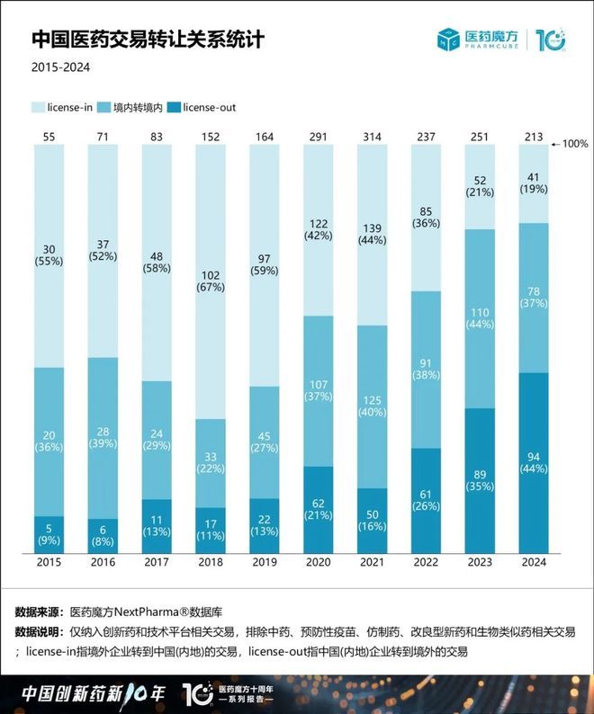 根据医药魔方发布的《从引进到引领:中国创新药交易十年全景透视》研究报告显示,2015-2024年间,中国医药交易转让事件数量呈现从递增到震荡的特征变化。